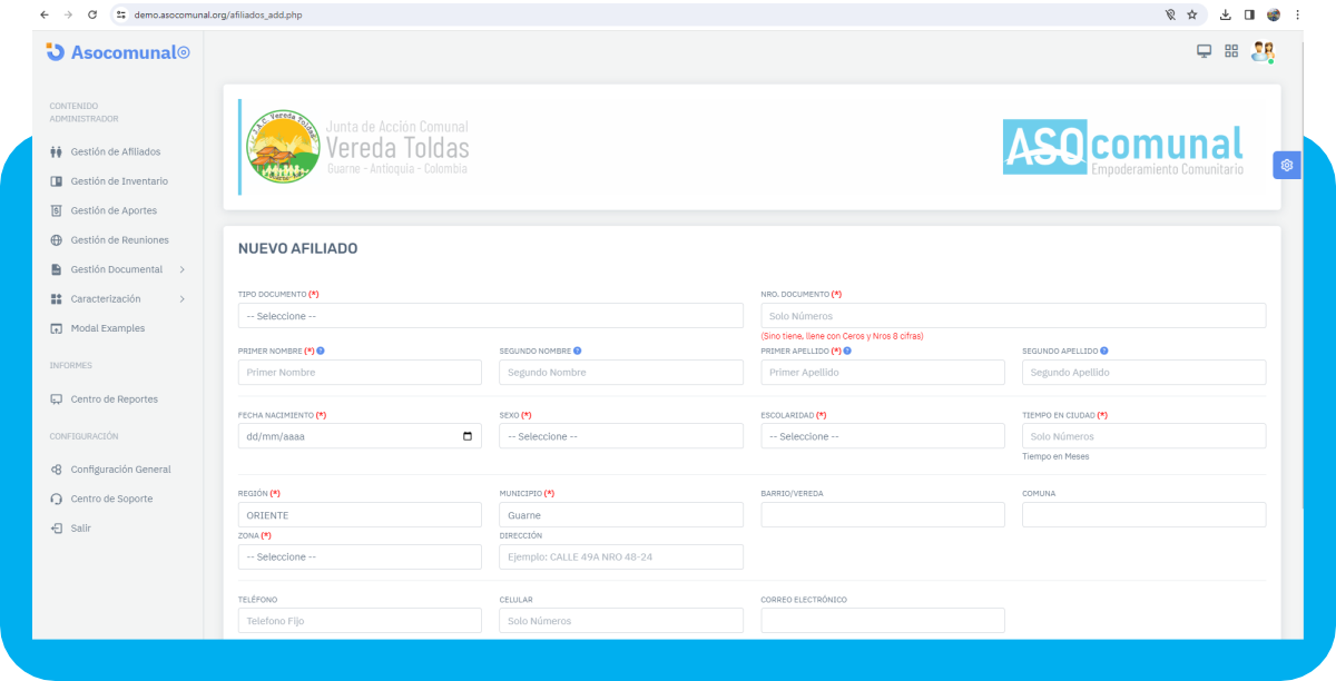 Asocomunal es un aplicativo basado en la web diseñado específicamente para facilitar la gestión y organización de las juntas de acción comunal en Colombia. Permite sistematizar todos los libros, procesos y actividades de cada una de las Juntas comunales.